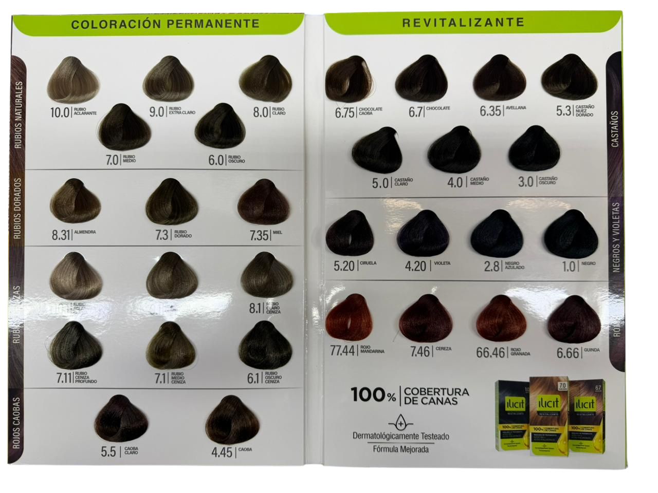 Tu coloración de siempre con tonos intensos de larga duración que hidratan y protegen tu cabello, 100% permanente, cobertura de canas, color de larga duración, más sano, fuerte y brillante. Enriquecido con lecitina de soya, que hidrata y protege tu cabello.